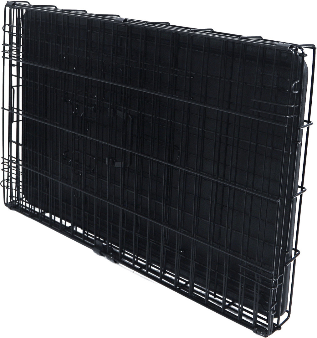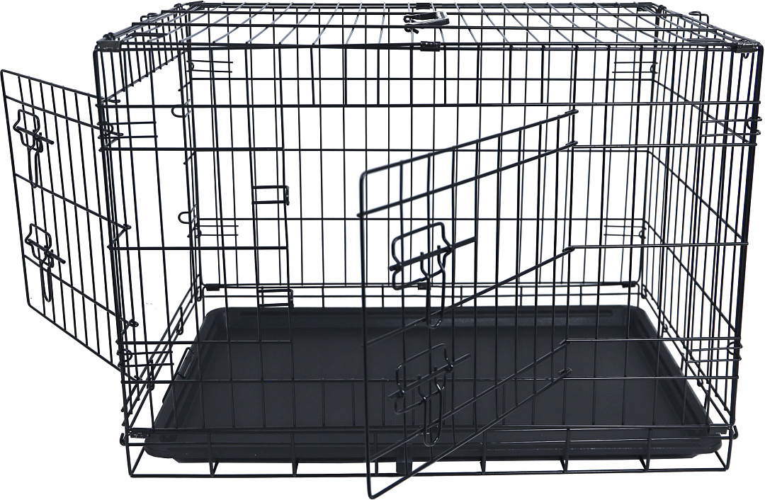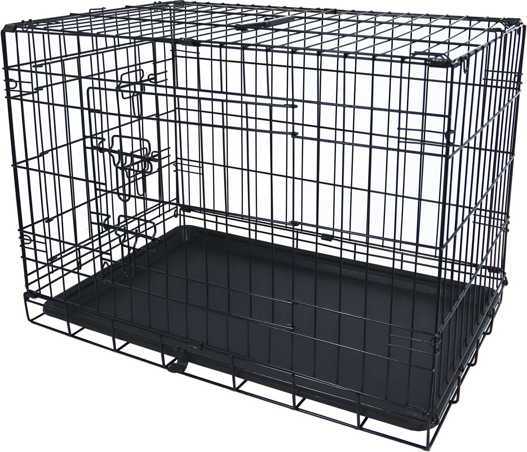 Deze draadkooi heeft twee deuropeningen, een ABS plastic lade en een handvat om de draadkooi makkelijk te verplaatsen. Draadkooien worden ook benches genoemd. Eenvoudig opvouwbaar.