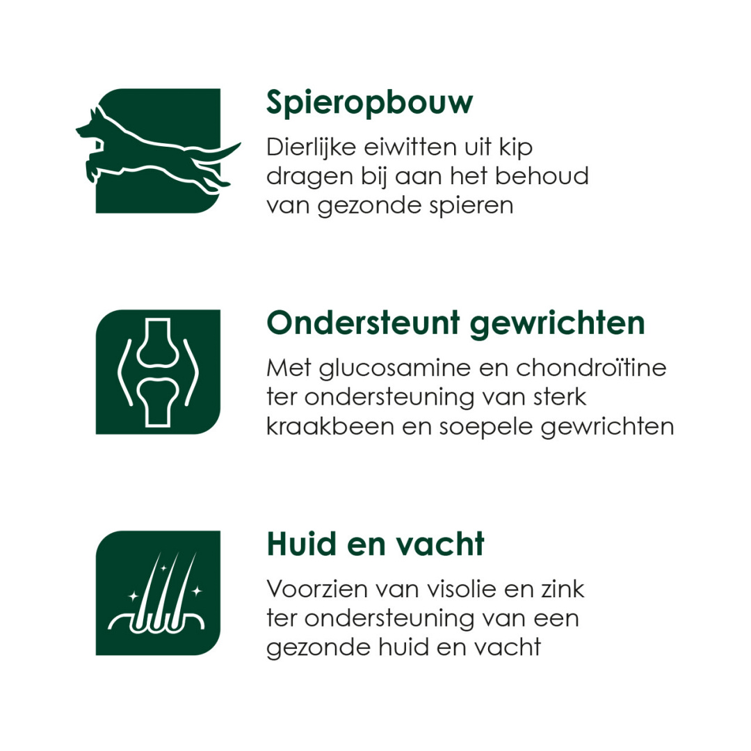 | Spieropbouw Dierlijke eiwitten uit kip dragen bij aan het behoud van gezonde spieren. |
