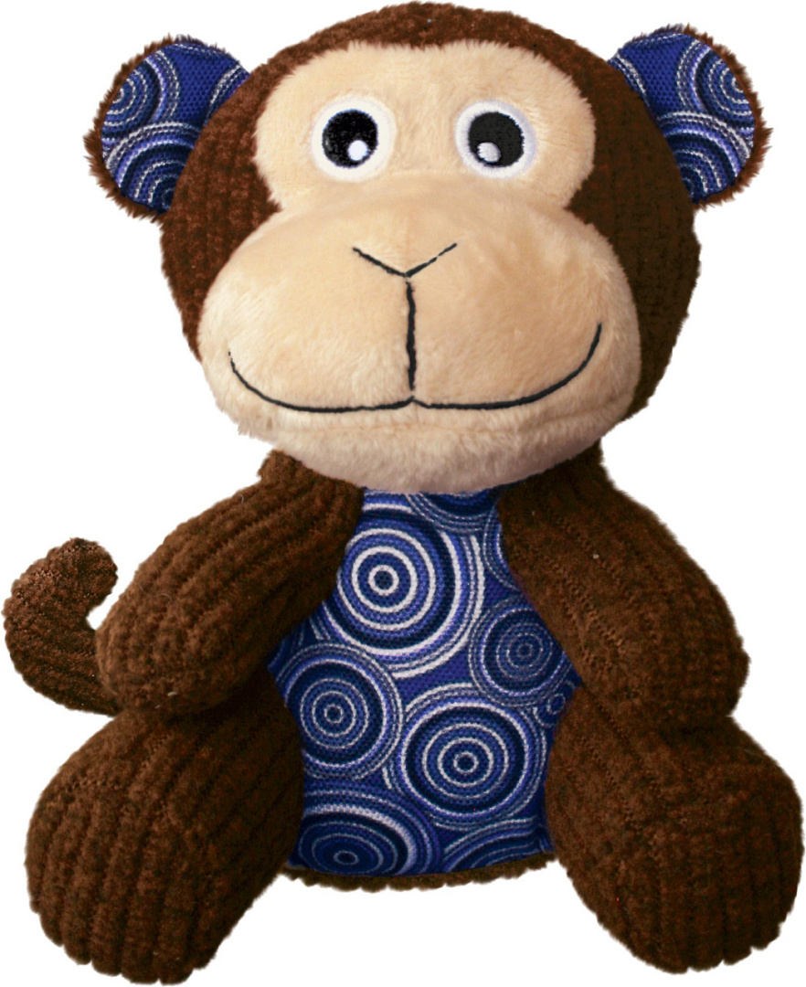 De vrolijke Kong Patches Cordz monkey maakt honden blij met allerlei interessante texturen en slappe armen, benen en staarten die plezier toevoegen aan zachte apporteerspelletjes.