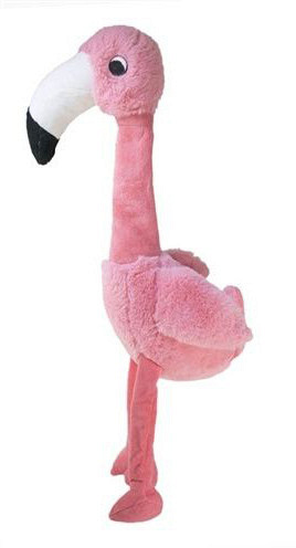 De Kong Shakers Honkers flamingo heeft een lange vorm met een nek met daarin een structuur die aanzet tot kauwen. Door de slappe poten kan de hond lekker met de flamingo schudden.