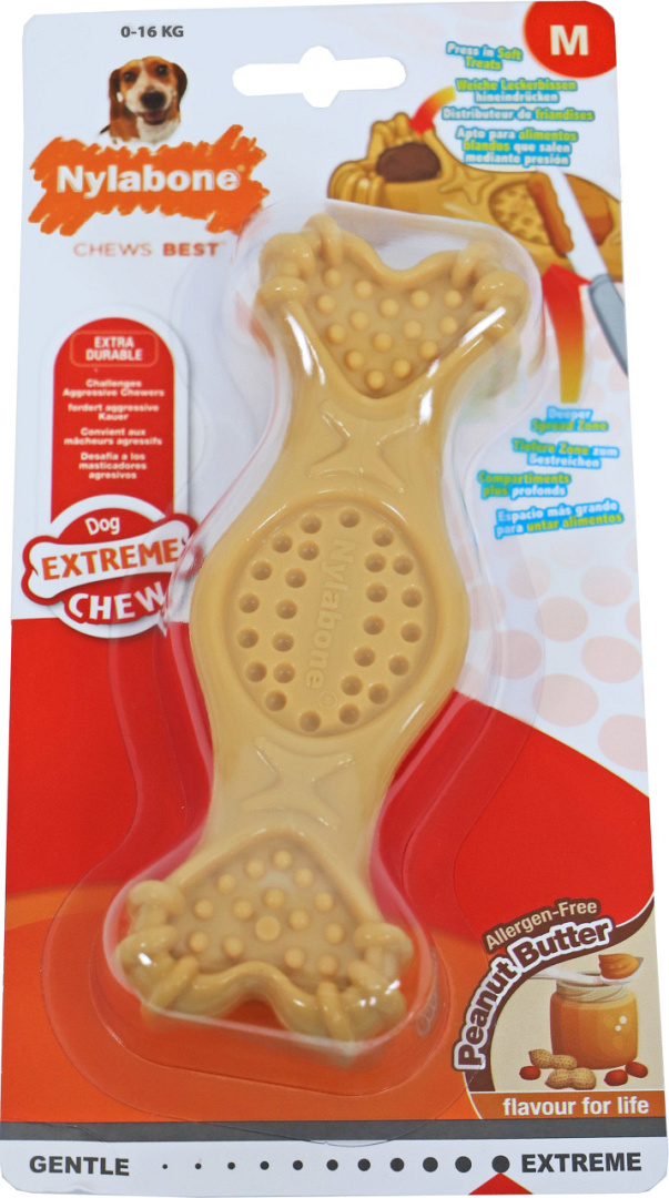 Nylabone Extreme Chew fill it & treat M is geschikt voor volwassen honden met een stevige kauwbehoefte. Deze kluif heeft gaatjes en bobbeltjes, geschikt om lekkernijen op te smeren voor een extra traktatie voor jouw hond.
