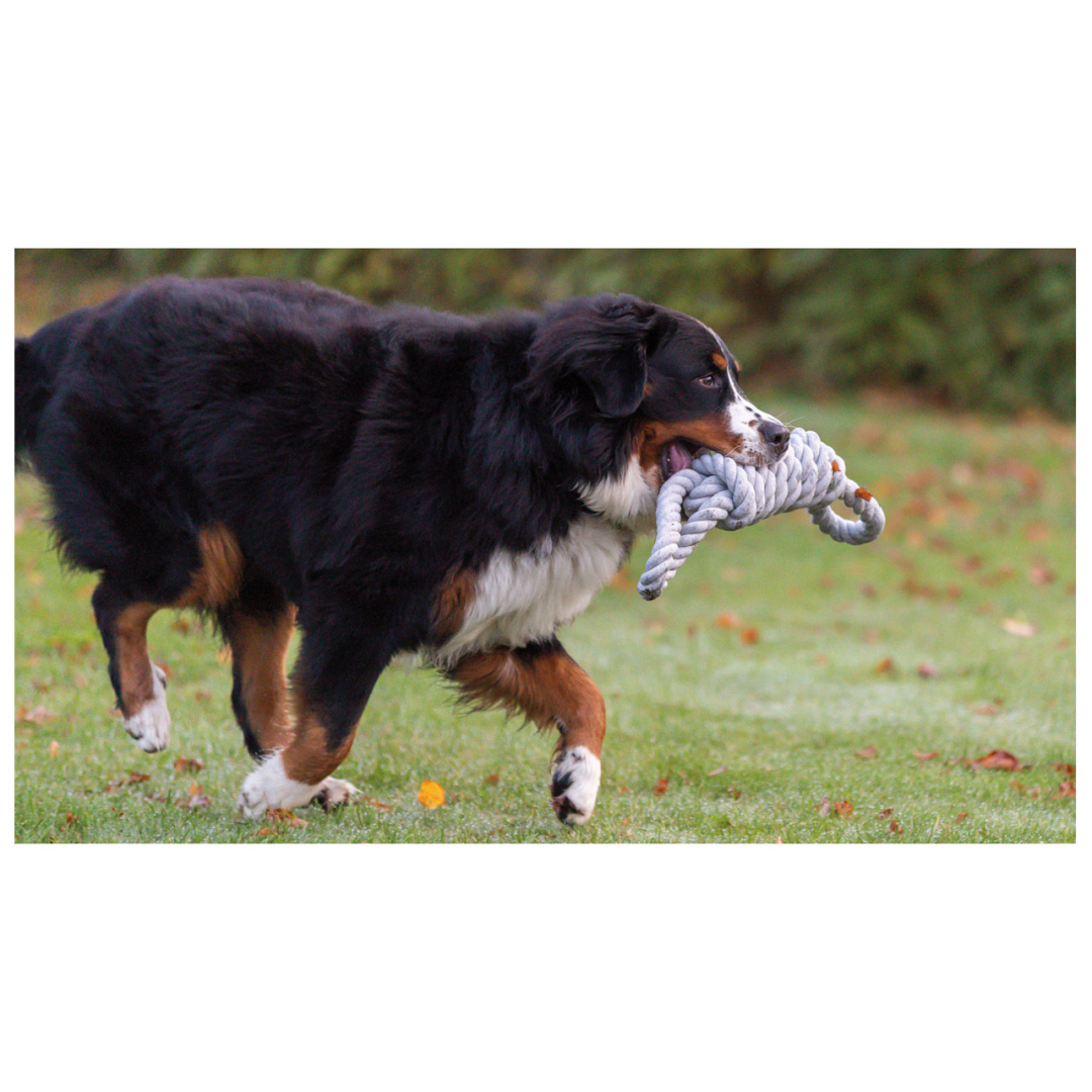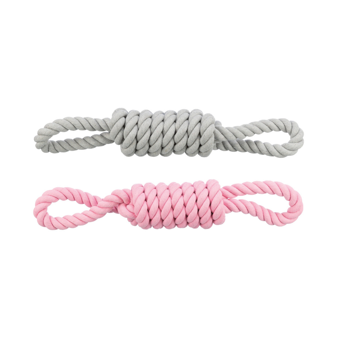 Flostouw van katoen/polyester, met knoop in het midden. Leuk voor trek en apporteerspelletjes. Wanneer er door je hond op op gekauwd wordt reinigt het de tanden.