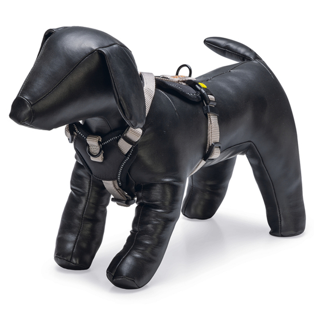 Luxe, volledig verstelbaar, nylon Y-tuig met neopreen voering. Om trekken tegen te gaan kan de riem ook aan de voorkant van het tuig bevestigd worden.