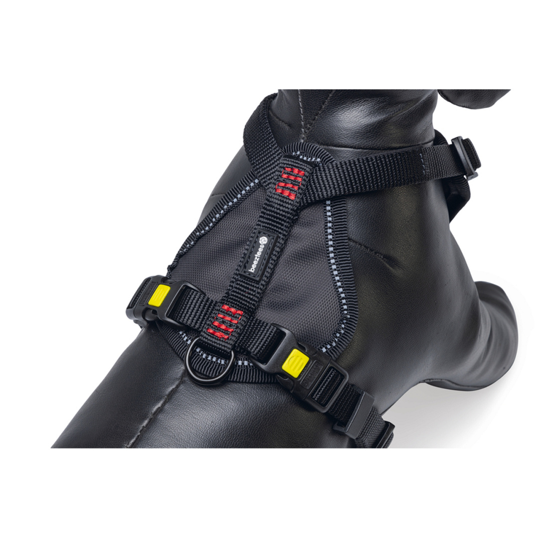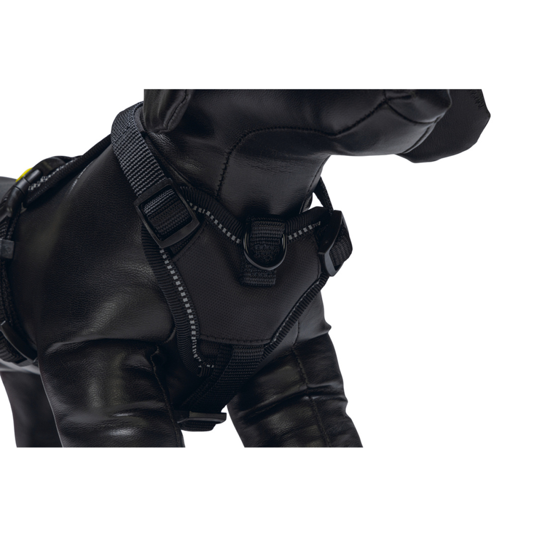 Luxe, volledig verstelbaar, nylon Y-tuig met neopreen voering. Om trekken tegen te gaan kan de riem ook aan de voorkant van het tuig bevestigd worden.