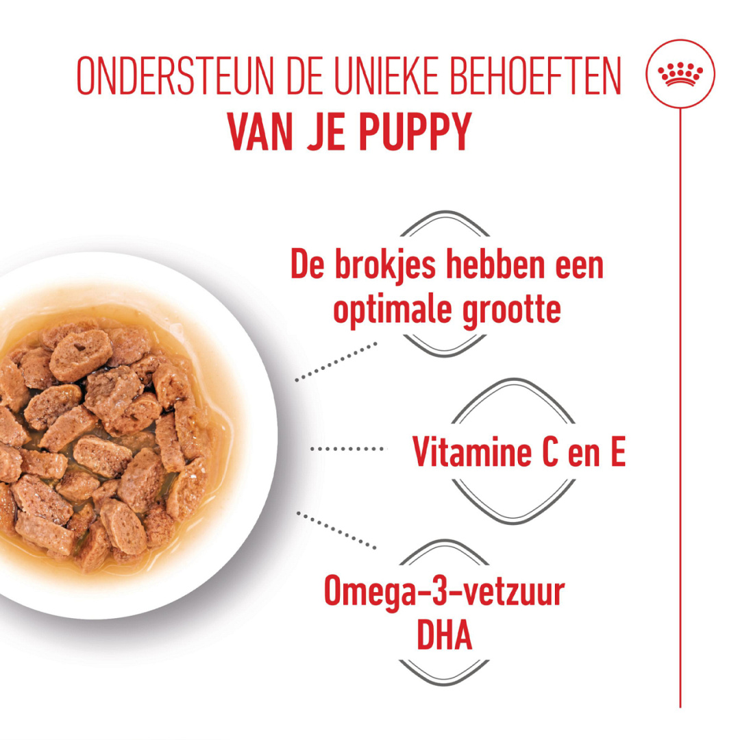 Je pup is gezond, toch? Of zou hij in deze snelle groeifase extra natuurlijke weerstand kunnen gebruiken? Royal Canin Mini Puppy Wet is speciaal ontwikkeld om de groei van je pup met een verwacht volwassen gewicht tot 10 kg te ondersteunen.