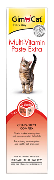 De GimCat Multi-Vitamine pasta Extra met de unieke celbeschermingsformule bevat een complex van essentiële omega 3- en omega 6-vetzuren. De nieuwe 3-in-1-combinatie van 12 essentiële vitamines, hoogwaardige visolie en bèta-glucanen zorgen samen voor een versterking van het immuunsysteem.