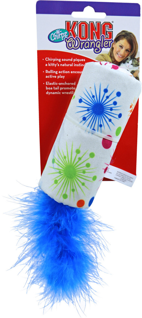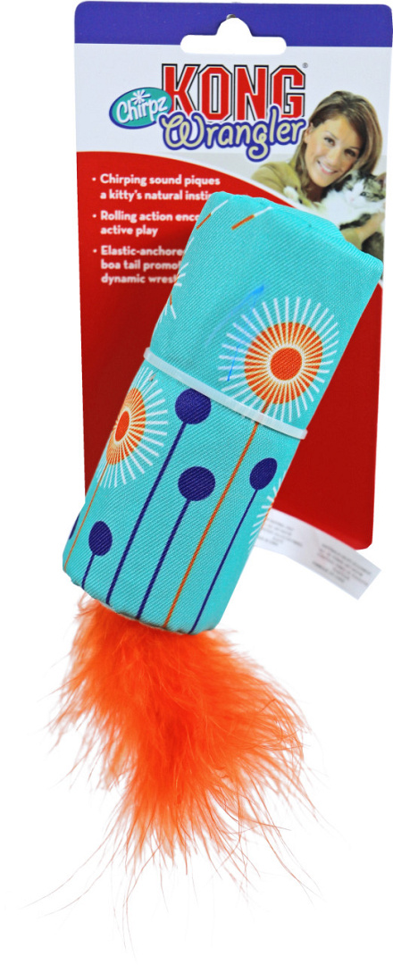 De Kong Wrangler Chirpz met zijn unieke getjilpgeluid roept katten op tot een rollende, kronkelende en springende speelpartij. Hiermee wordt het natuurlijke instinct van jouw kat gestimuleerd om te jagen en te worstelen. Als de Kong Wrangler Chirpz rolt, zorgt de heldere boa-staarttrekkingen voor een onweerstaanbare uitnodiging voor katten voor langdurige, actieve speelsessies.