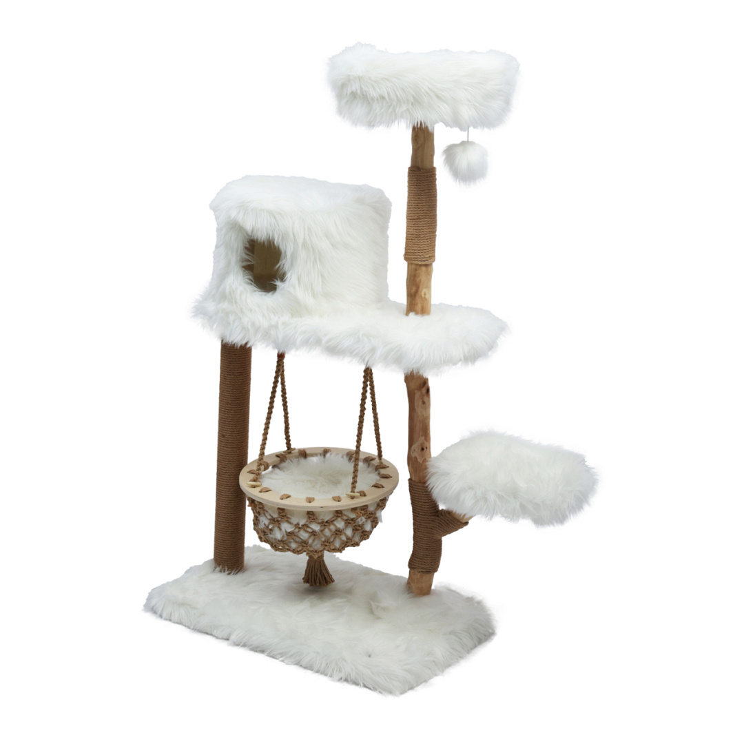 Uniek krabmeubel van natuurlijke houten stammen, met drie pluchen plateaus, een hangmat en een fijn holletje.