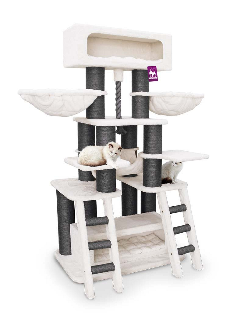 Petrebels krabmeubel Lucky Bastards Skybox 187 heeft vriendelijke strakke vormen, fluweelzachte kussens en oneindig veel knusse slaapplekjes. Het meubel is stevig en stabiel door de extra dikke bodemplaat en krabstammen van maar liefst 15 centimeter dik. Zoek je een echt kattenkasteel voor jouw kat? Dan is de Skybox 187 een goede keus!