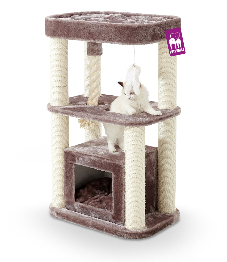 Petrebels krabpaal Villa 100 is een krabpaal van bescheiden hoogte, die toch heel compleet is. Als je nog klein bent of een beetje oud, dan is het fijn als je overal makkelijk bij kunt. In deze krabpaal kan jouw kat heerlijk slapen, klimmen en spelen. En omdat krabben ook heel belangrijk is, heeft deze fijne krabpaal stevige krabstammen. En als kers op de taart is deze krabpaal afgewerkt met fluweelzachte pluche, een vast speeltouw en een extra stabiele bodemplaat. Fijn én heel veilig dus.