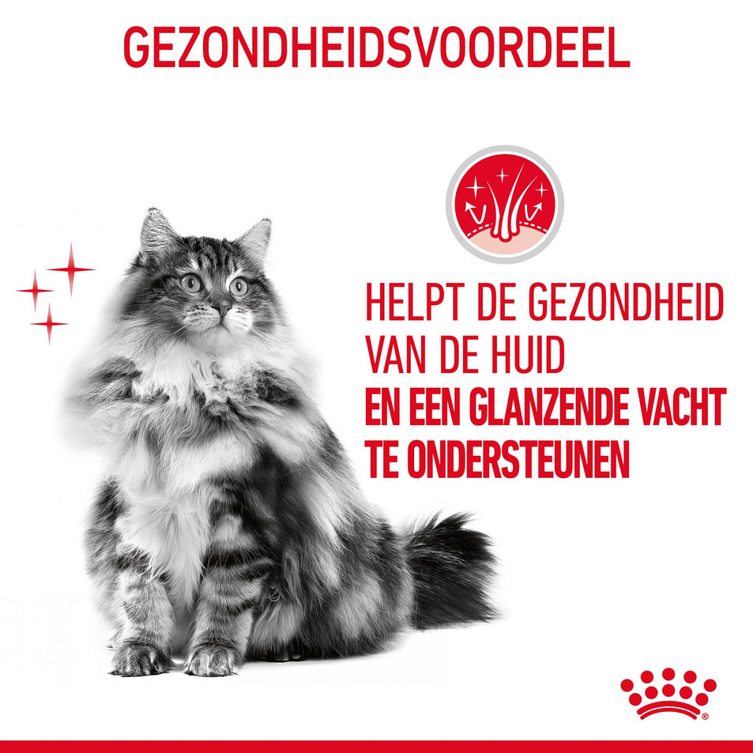 Het onderhouden van de vacht van je kat is een uitdaging, vooral voor langharige rassen. De juiste voedingsstoffen kunnen de vacht van je kat ondersteunen zodat haar natuurlijke schoonheid volledig tot zijn recht komt. Royal Canin Hair & Skin in Gravy bevat omega 3- en omega 6-vetzuren die de mooie vacht en gezonde huid van je kat ondersteunen.