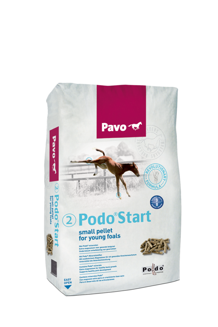 Pavo PodoStart (5mm brok) is niet alleen rijk aan hoogwaardige eiwitten (essentiële aminozuren), maar voorziet ook in alle noodzakelijke vitaminen en mineralen die uw jonge veulen nodig heeft. Het zorgt voor een goede basis bij de overgang van merriemelk naar vaste voeding. Extra magnesium ondersteunt de snelle botgroei tijdens de groeispurt en koper, zink en mangaan in goed opneembare vorm zorgen voor een ongestoorde botgroei. Voor een verantwoorde groei van het jonge veulen, vanaf 3 weken tot een leeftijd van 8 maanden.