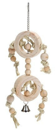 Een ware aanwinst voor de vogelkooi! Speeltje van hout met belletje en een ophanghaak. Lengte 40 cm.